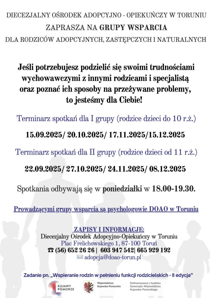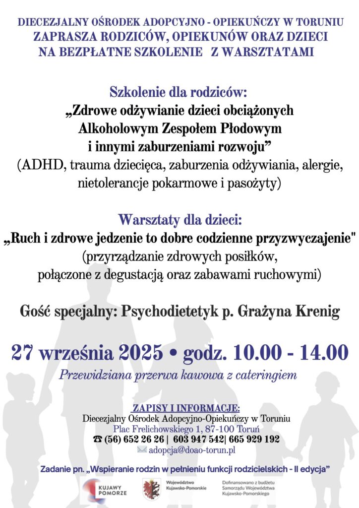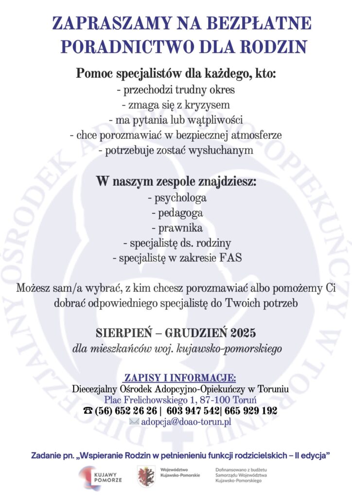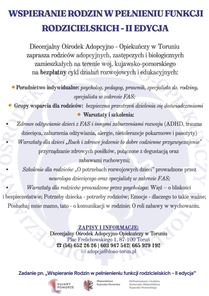 W związku z tym mamy dla Państwa wiele ciekawych propozycji! Zapraszamy rodziny adopcyjne, zastępcze i naturalne z województwa kujawsko- pomorskiego do zapoznania się z informacjami zawartymi na plakatach i zgłaszania swojego uczestnictwa w szkoleniach, warsztatach, grupach wsparcia i indywidualnym poradnictwie.